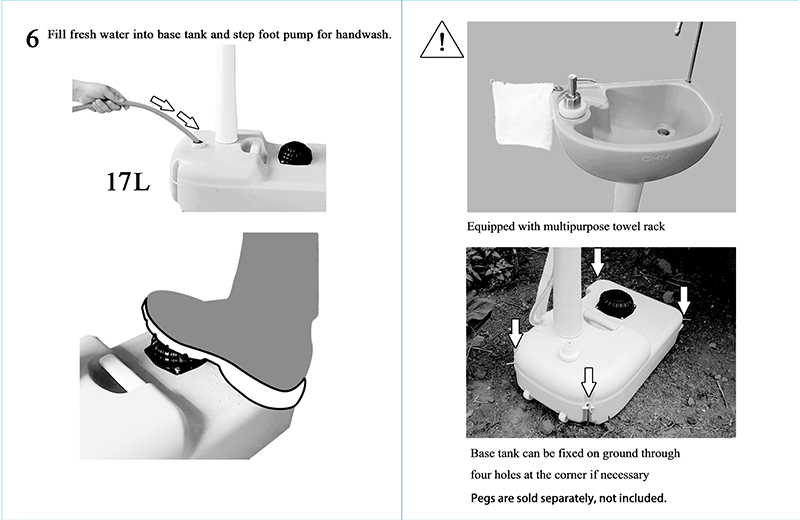 - Safe material: Feel reliable to wash foods, dishes, etc as the hand washing station adopts food-safety materials (HDPE & PP). The surface of the camping wash basin prevents stains to make cleaning easier